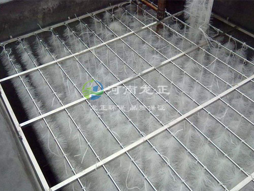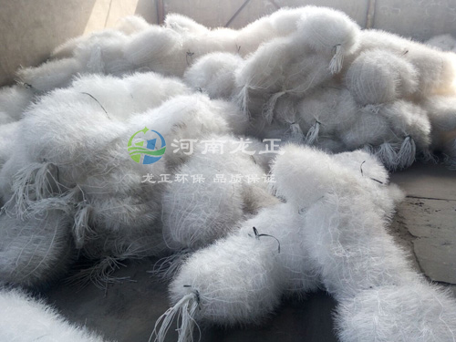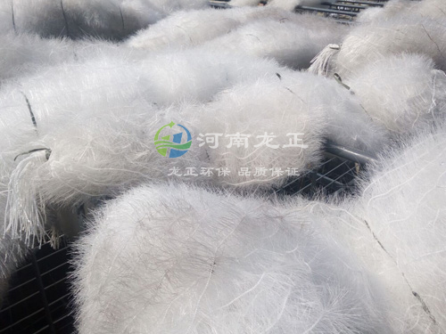 立體彈性填料篩選了聚烯烴類和聚酰胺中的幾種耐腐、耐溫、耐老化的品種,混合以親水、吸附、抗熱氧等助劑,采用特殊的拉絲,絲條制毛工藝,將絲條穿插固著在耐腐、高強度的中心繩上,由于選材和工藝配方精良,剛?cè)徇m度,使絲條呈立體均勻排列輻射狀態(tài),制成了懸掛式立體彈性填料的單體,彈性填料在有效區(qū)域內(nèi)能立體全方位均勻舒展?jié)M布,使氣、水、生物膜得到充分混滲接觸交換,生物膜不僅能均勻的著床在每一根絲條上,保持良好的活性和空隙可變性,而且能在運行過程中獲得愈來愈大的比表面積,又能進行良好的新陳代謝。